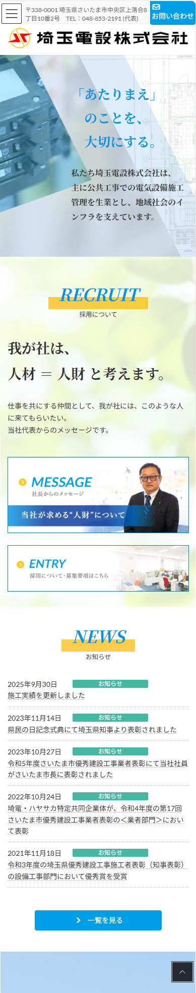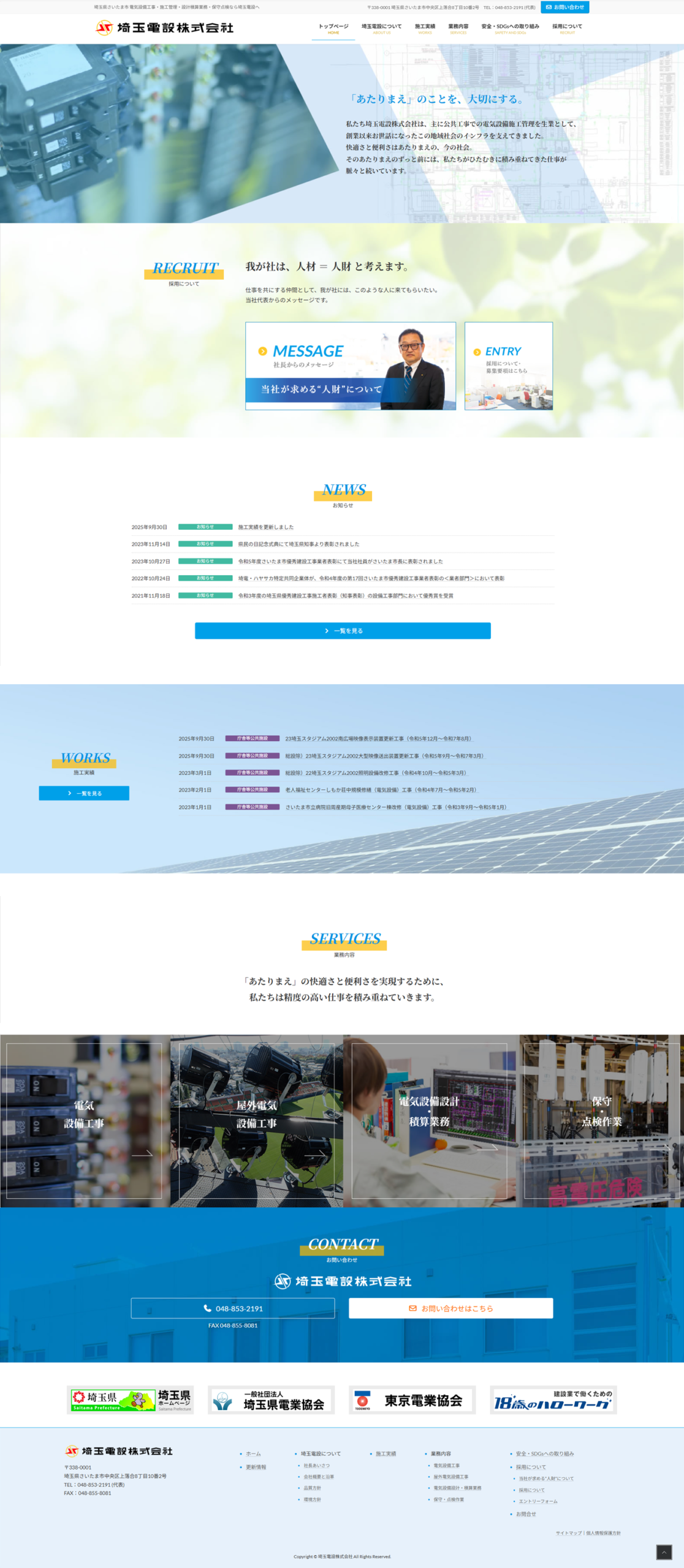 埼玉電設株式会社 2026年1月8日 最終更新日時 : 2026年2月18日 media PCサイト スマホサイト このプロジェクトのポイント ブロックパターンの活用によるコストダウン このプロジェクトでは、一からデザインを作成するのではなく、ブロックパターンの活用を通じて、制作にかかる時間とコストを大幅に削減し、クライアントは質の高いウェブサイトを予算内で実現できました。 現場撮影・ヒアリングによる採用情報ページ 採用情報のコンテンツに関しては現場のリアルな情報が求職者にとって非常に価値があるため、専門のカメラマンが現場で撮影を行い、スタッフからの直接のコメントを多数掲載しました。求人への応募意欲を高めるコンテンツに仕上がっています。